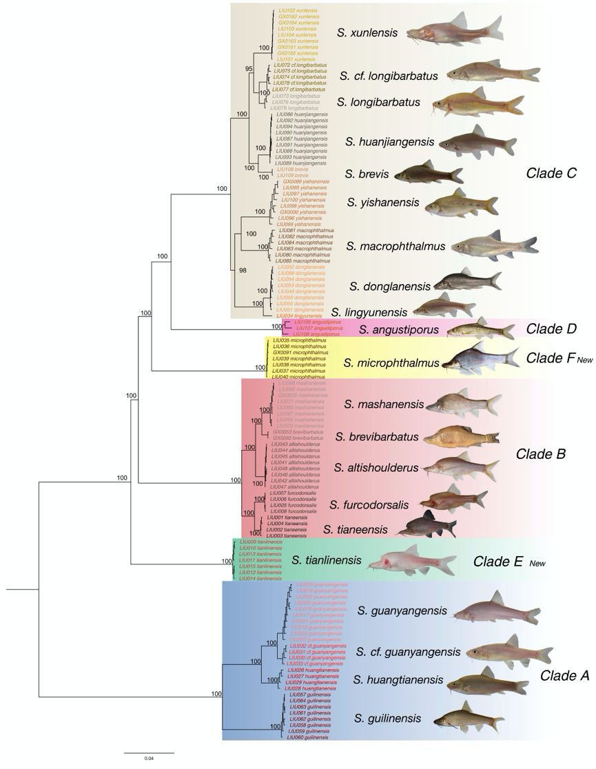 在先前的研究中,由于形態相似,天峨金線鲃和叉背金線鲃難以區分,馬德華團隊觀察到在長須金線鲃和灌陽金線鲃的棲息地中,似乎存在與它們形態相似的金線鲃屬物種,但不好分辨。為了解決這些問題,他們利用貝葉斯因子定界方法對它們進行物種定界。該方法的優點是可以用來分析上千單核苷酸多態性位點(SNPs)數據,并通過共顯性標記直接推算物種樹,而不需要估算基因樹。分析結果表明天峨金線鲃和叉背金線鲃確實為兩個不同的物種,與長須金線鲃和灌陽金線鲃相似的兩個物種則被界定為新種。研究團隊認為,這是“小種群成種事件”發揮了重要作用,在有一定程度環境隔離的小種群中,由于遺傳漂變以及自然選擇的強效應,比較容易發生在遺傳組成上快速偏離母種群并形成和發展為新物種的情況,這樣的分化機制可能是金線鲃屬魚類物種多樣性豐富的原因之一。