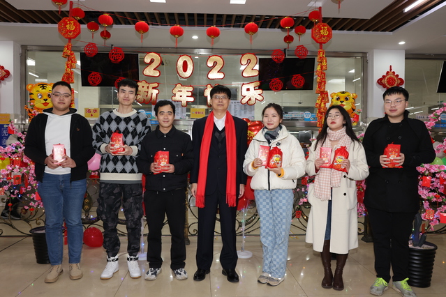 在廣西大學(xué)萃苑餐廳,羅廷榮代表學(xué)校向留校過年的同學(xué)們送上新春的問候與祝福,為同學(xué)們分發(fā)“春節(jié)紅包”和“福袋”,為近兩天過生日的2名同學(xué)慶生,與大家同唱生日歌、同切生日蛋糕,并與同學(xué)們一起吃年夜飯,拉家常、話發(fā)展。