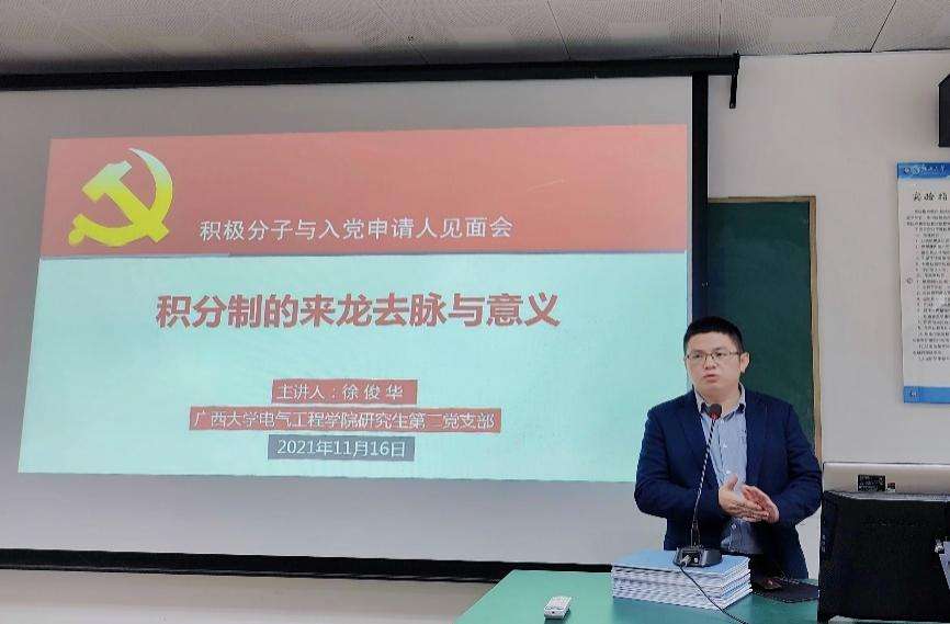 廣西大學電氣工程學院研二黨支部牢固樹立將黨員的政治教育建設居于首位的工作導向,積極引導黨員創先爭優,打造“思政沙龍+學術講座”等系列特色活動,以“黨建+科研”模式培育科研棟材,激發科研思想火花。