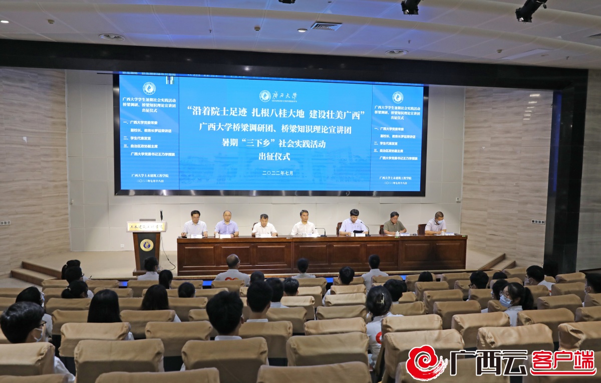 7月18日,“沿著院士足跡、扎根八桂大地、建設(shè)壯美廣西”廣西大學(xué)橋梁調(diào)研團(tuán)、橋梁知識理論宣講團(tuán)暑期“三下鄉(xiāng)”社會實踐活動出征儀式在土木建筑工程學(xué)院舉行。自治區(qū)政協(xié)副主席、廣西大學(xué)黨委書記王乃學(xué)出席出征儀式并為實踐隊授旗。