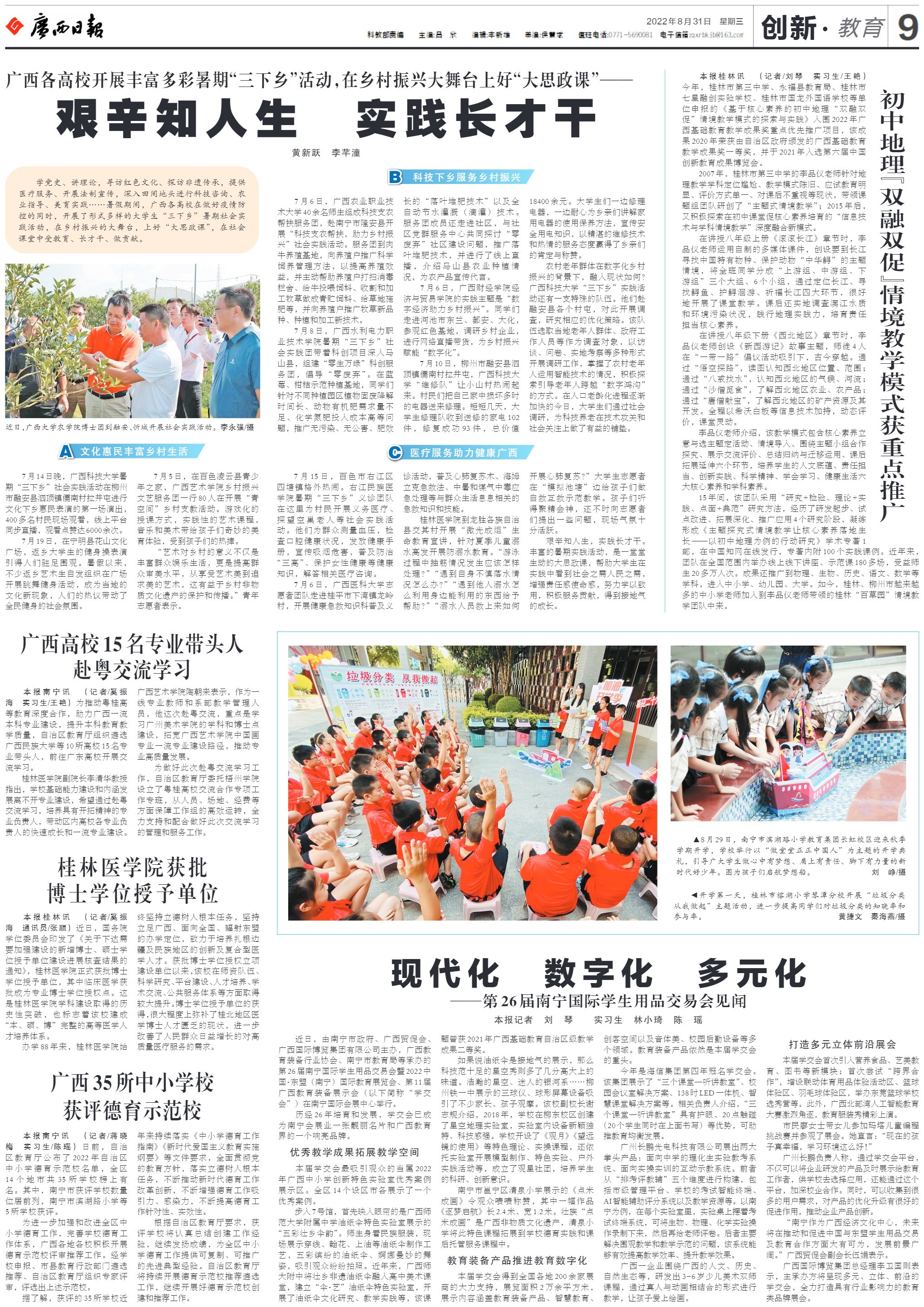 學黨史、講理論,尋訪紅色文化、探訪非遺傳承,提供醫療服務、開展法制宣傳,深入田間地頭進行科技咨詢、農業指導、美育實踐……暑假期間,廣西各高校在做好疫情防控的同時,開展了形式多樣的大學生“三下鄉”暑期社會實踐活動,在鄉村振興的大舞臺,上好“大思政課”,在社會課堂中受教育、長才干、做貢獻。