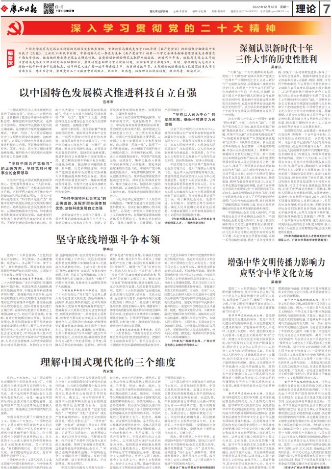 廣西大學具有馬克思主義研究的光輝歷史和優良傳統。首任校長馬君武先生于1906年將《共產黨宣言》的綱領部分翻譯成中文刊載于《民報》,上世紀30年代中后期,中共創始人之一李達先生和《共產黨宣言》的第一個中文全譯本翻譯者陳望道先生都曾在廣西大學任教。該校始終傳承馬克思主義研究傳統,在黨的創新理論研究上取得卓越成效。新時代十年來,該校馬克思主義學院注重將馬克思主義理論研究與實際相結合,聚焦研究基礎理論重大現實問題,獲國家級重大課題5項。目前,學校擁有馬克思主義理論一級學科博士學位授權點,該學科已入選廣西一流學科建設名單。為更好交流學習,本期理論版邀請該校5位國家級重大項目首席專家、博士生導師,聚焦黨的二十大報告中的新觀點、新論斷、新思想,結合理論和現實問題,提出思考。敬請關注。