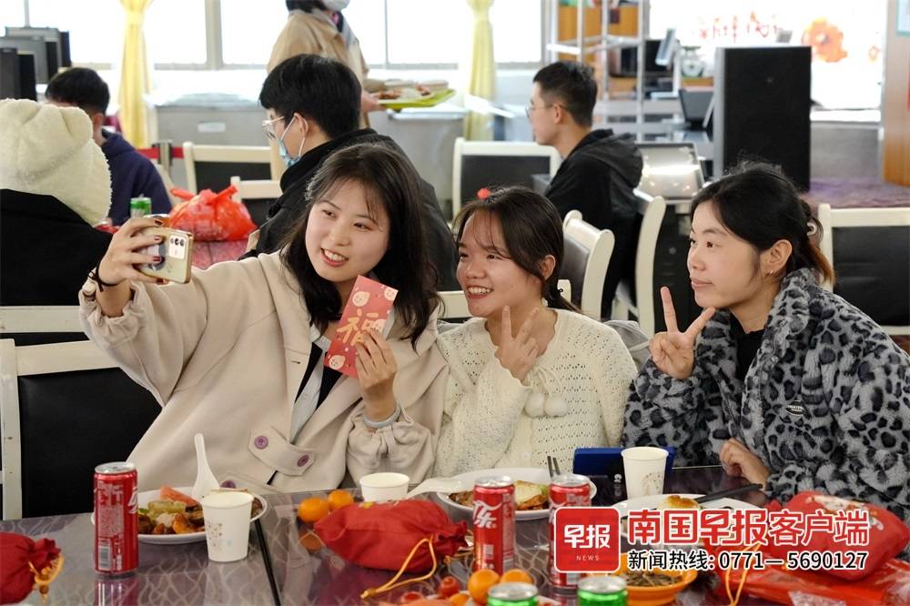 1月21日下午,廣西大學領導與留校學生同吃年夜飯,共賀新春佳節。今年該校共有1200多名學生留校過年,學校全力做好服務保障工作,精心為留校過年的同學們準備豐盛的年夜飯、春節伙食補助金和“福袋”,讓留校學生歡度一個祥和幸福年。學校還為近兩天過生日的4名同學慶生,大家同唱生日歌、同切生日蛋糕,活動現場其樂融融。留校學生陳曉禹表示,感恩學校的暖心安排,讓她感覺留校過年和回家一樣,有滿滿的幸福感。