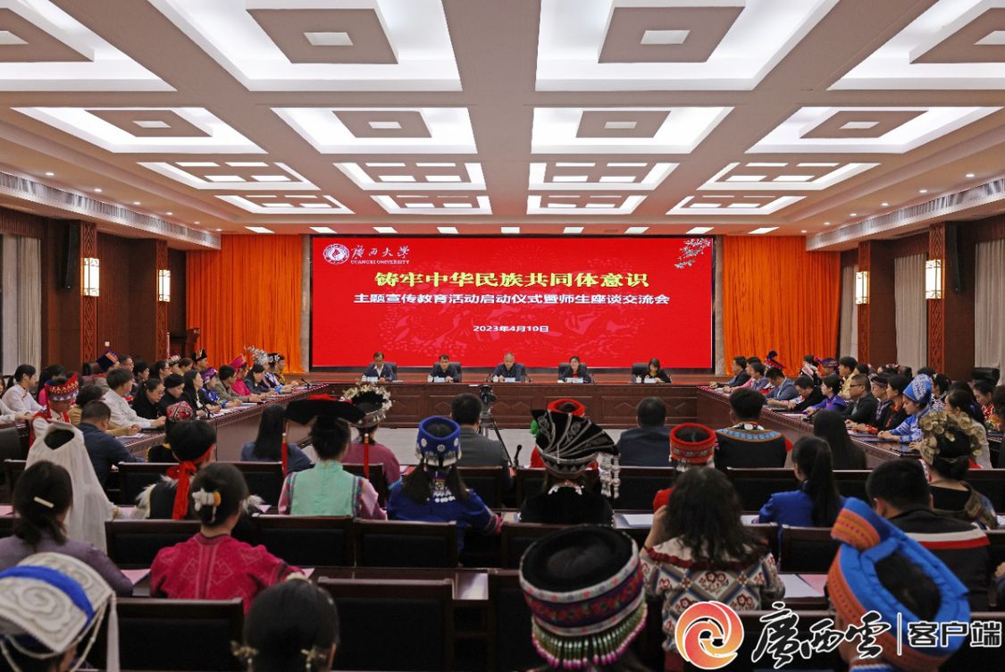 “我在一顆石榴里看見我的祖國,碩大而飽滿的天地之果······”4月10日,在廣西大學君武樓玉林廳,48位不同民族的師生代表,用深情的詩朗誦拉開了廣西大學2023年鑄牢中華民族共同體意識主題宣傳教育活動啟動儀式暨師生座談交流會的序幕。全校26個學院的100余名師生代表在壯族“三月三”即將到來之際,身著民族盛裝,歡聚一堂,共唱民族團結之歌、共享民族進步之果、共話民族工作之策。