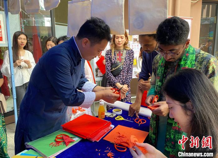 圖為留學生展示剪紙作品?!V西大學國際學院供圖
