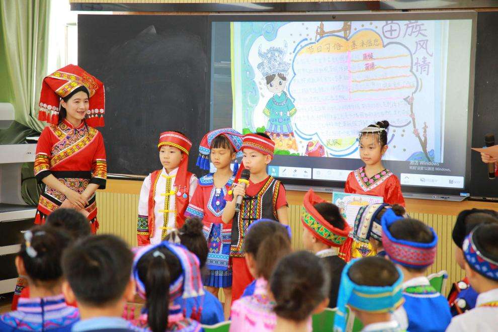 現場小學生們上臺展示了由小組共同繪制的民族知識手抄報,包含了壯族、瑤族、苗族、侗族、毛南族的民族起源、民族飲食文化、民族藝術特色和民族語言等知識。