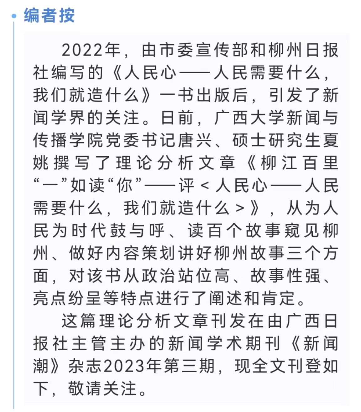 在疫情防控初期的2020年,全國(guó)上下口罩短缺,上汽通用五菱主動(dòng)緊急組織生產(chǎn)口罩,“為人民而生”的中國(guó)制造走紅。中國(guó)共產(chǎn)黨柳州市第十三次代表大會(huì)提出:“人民需要什么,我們就造什么。”這是柳州一以貫之的為民初心。2022年,由中共柳州市委宣傳部和柳州日?qǐng)?bào)社編寫的《人民心——人民需要什么,我們就造什么》一書出版,全面生動(dòng)地講述100個(gè)為民故事,為奮力譜寫中國(guó)式現(xiàn)代化廣西篇章做出柳州貢獻(xiàn),彰顯柳州人的使命擔(dān)當(dāng)!