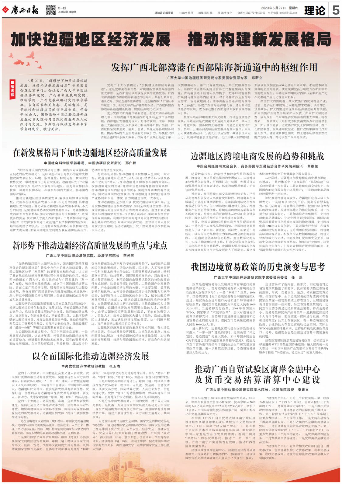 “加快構建以國內大循環為主體、國內國際雙循環相互促進的新發展格局”是黨中央作出的重大戰略部署。我國邊疆地區處于“雙循環”的重要節點和結合部,這決定了其必然在構建新發展格局過程中發揮獨特的作用。地處西南邊疆的廣西大學,作為教育部與廣西共建的“雙一流”高校,響應國家戰略需求,成立了中國邊疆經濟研究院,旨在立足廣西經濟發展,服務國家發展戰略和邊疆經濟發展,充分發揮廣西民族特色和毗鄰東盟的地緣優勢,深入研究中國邊疆經濟發展問題,促進邊疆地區的對外開放和高質量發展。
