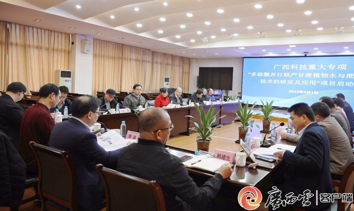 2023年2月,廣西大學綠色制糖團隊牽頭的廣西糖料蔗科技重大專項項目正式啟動。該項目以廣西大學自主研發的多級膜并行聯產甘蔗植物水與蔗糖關鍵技術為基礎,優化膜組合及其集成工藝,深入研究甘蔗原料特異成分對膜集成工藝與甘蔗植物水產品質量的影響,揭示甘蔗特性對甘蔗植物水品質的影響機制,建立甘蔗植物水特征成分及特性功能的定向調控方法,創建甘蔗糖業“水—糖”聯產模式,實現甘蔗植物水商品化利用,變“廢”為寶,顯著提高經濟效益;開發提水濃縮汁生產白砂糖脫色技術,研究利用發酵技術和合成生物學技術制備低/無醇甘蔗酒等發酵飲品及原人參二醇、三醇等高值化產品,為甘蔗糖業向高端飲品、醫藥及大健康等產業拓寬延伸提供技術支撐,全面推動廣西甘蔗糖業向綠色集群化轉型升級,確保我國甘蔗糖業健康穩定發展,保障國家食糖安全供給,助力鄉村振興、地方經濟實體發展和社會穩定。