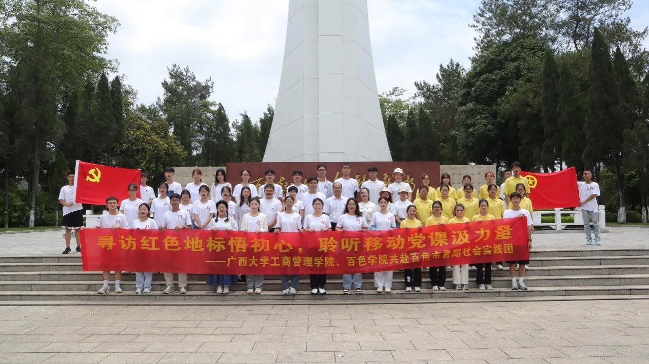 廣西大學工商管理學院與百色學院工商管理學院實踐團聯合在百色開展“壯美千姿百色紅,研學筑夢青春行”為主題的社會實踐活動,來到革命老區百色市走近革命博物館、紀念館、黨史館、烈士陵園等紅色基因庫,訪紅色地標悟初心,聆聽移動黨課汲力量。一寸山河一寸血,一抔熱土一抔魂。新中國是無數革命先烈用鮮血和生命鑄就的。在本次暑期社會實踐活動中,兩校青年實踐團跟隨革命先烈的步伐,親身感受到了先烈們為民族獨立和解放事業所做出的巨大犧牲和貢獻,通過行動向革命先烈表示崇高的敬意。