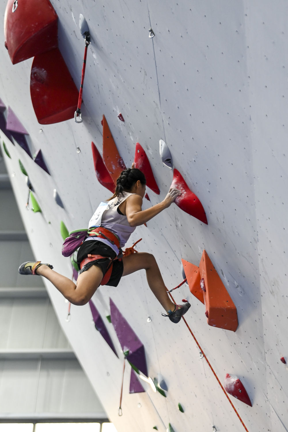 在廣西馬山縣古零鎮初級中學攀巖館,李彥郯在第一屆全國學生(青年)運動會攀巖項目難度賽的比賽中。新華社記者 曹祎銘 攝