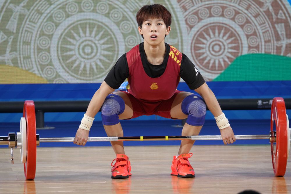 在舉重女子45公斤級比賽中,福建選手徐璐瑩抓舉85公斤平世界紀錄。賽事組委會供圖