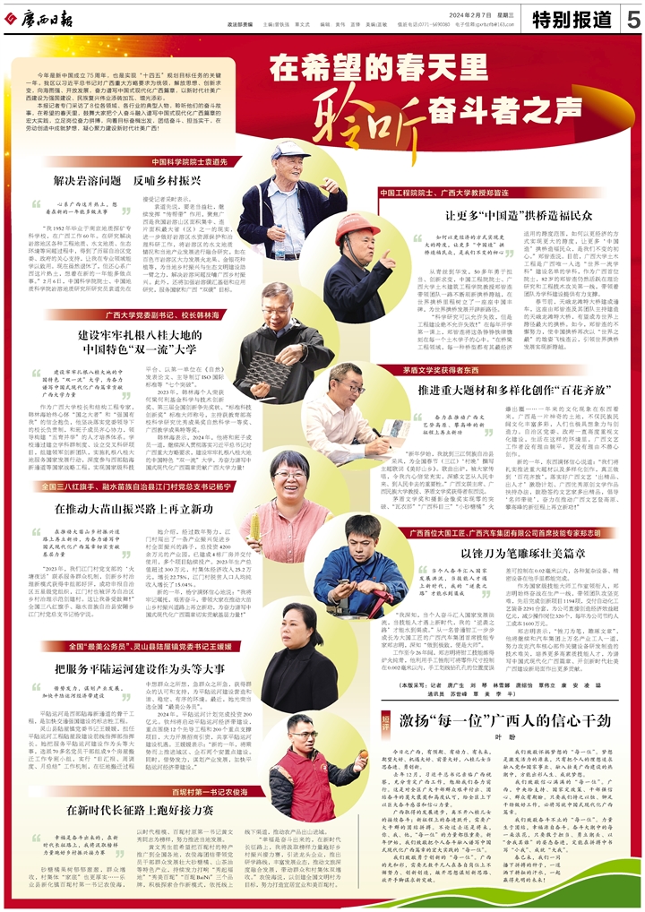 本報(bào)記者專門(mén)采訪了8位各領(lǐng)域、各行業(yè)的典型人物,聆聽(tīng)他們的奮斗故事,在希望的春天里,鼓舞大家把個(gè)人奮斗融入譜寫(xiě)中國(guó)式現(xiàn)代化廣西篇章的宏大實(shí)踐,立足崗位奮力拼搏,向著目標(biāo)奮楫出發(fā),團(tuán)結(jié)奮斗、擔(dān)當(dāng)實(shí)干,在勞動(dòng)創(chuàng)造中成就夢(mèng)想,凝心聚力建設(shè)新時(shí)代壯美廣西!