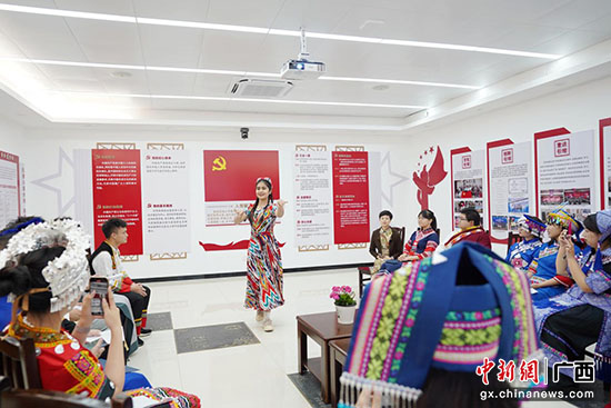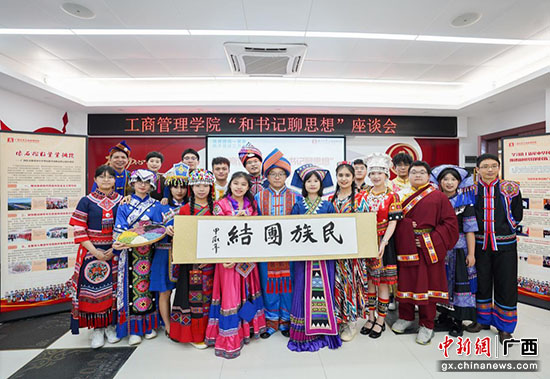 身著壯族傳統服飾的廣西大學工商管理學院黨委書記羅誠與漢族、壯族、苗族、瑤族、仫佬族、維吾爾族、納西族、傣族、滿族等14個民族的學生代表歡聚一堂,唱支山歌給黨聽、同心共話民族情。