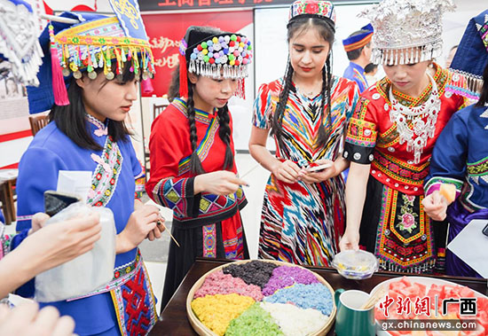 師生們品嘗壯族五色糯米飯。王瀟 攝