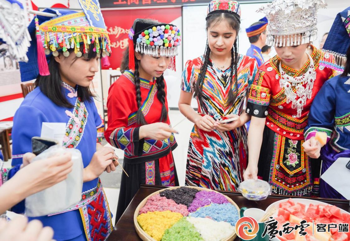 身著壯族傳統服飾的學院黨委書記羅誠與漢、壯、苗、瑤、仫佬、維吾爾、納西、傣、滿等14個民族的學生代表歡聚一堂,唱支山歌給黨聽、同心共話民族情。