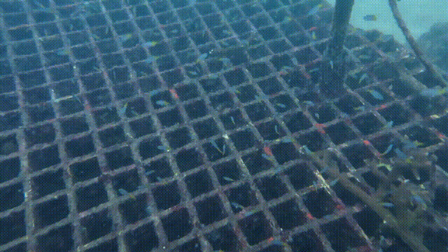 成群的魚兒圍著這個架子游來游去,珊瑚苗還很小,相比別處的大珊瑚,它們就是“寶寶”。約莫十分鐘左右,一大片珊瑚種滿了海底的珊瑚架,今天的種植工作也就算完成了。