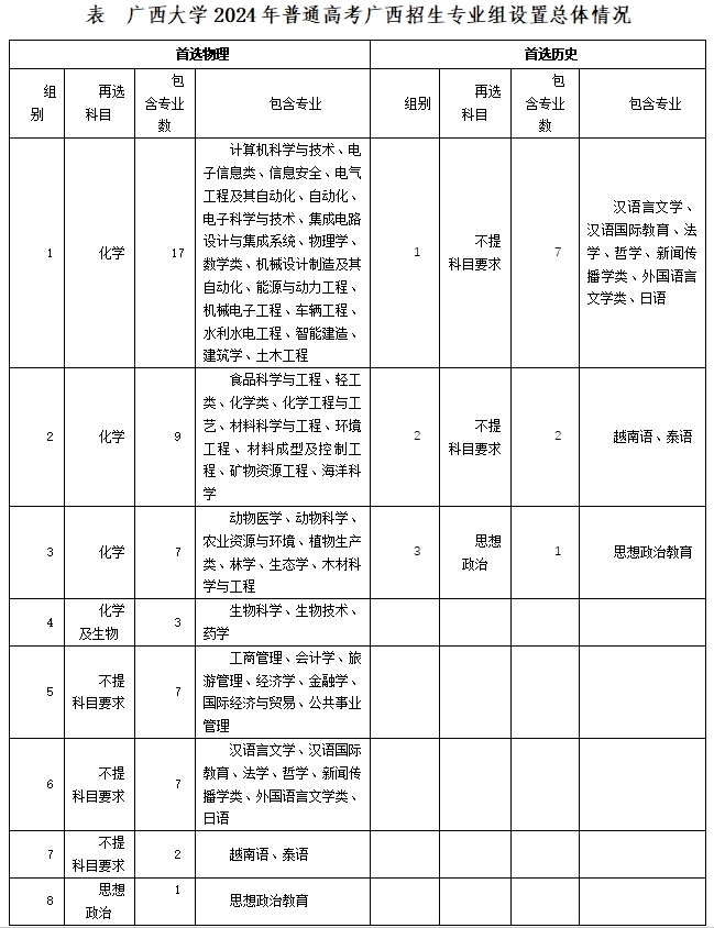 廣西大學2024年在其他實施高考綜合改革省份的招生專業組設置與往年一致。