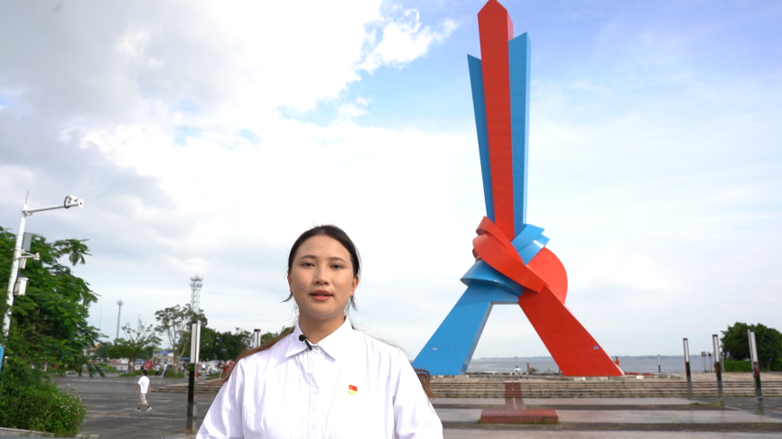 實踐團成員吳艷貝同學在山海相連地標廣場錄制絲路精神宣講視頻(張曉榮攝)