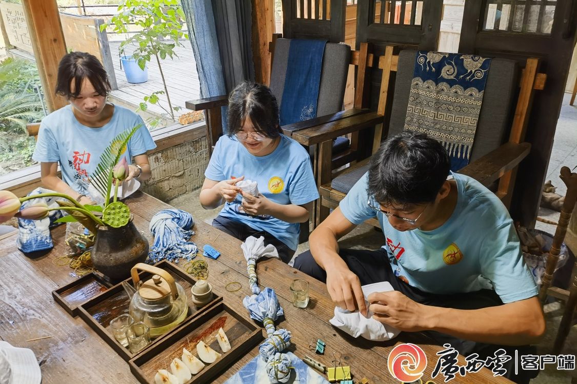 “我們立足侗鄉(xiāng)特色資源,通過(guò)深挖農(nóng)村的古建民宅、文化遺產(chǎn)、農(nóng)耕活動(dòng)、秀美山水等元素,開(kāi)發(fā)鄉(xiāng)村旅游、休閑農(nóng)業(yè)等項(xiàng)目,以農(nóng)文旅融合發(fā)展助推鄉(xiāng)村全面振興。”盛龍生態(tài)風(fēng)情園工作人員介紹。在這里,實(shí)踐團(tuán)師生通過(guò)捆扎、浸泡、取出、晾曬等工序,親身體驗(yàn)侗族扎染制作,切身感受中華傳統(tǒng)技藝源遠(yuǎn)流長(zhǎng)的文化底蘊(yùn)。