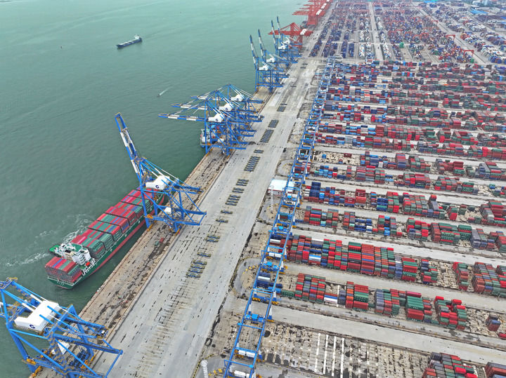 8月15日,貨輪在廣西北部灣港欽州港區自動化碼頭靠泊(無人機照片)。新華社記者 周華 攝