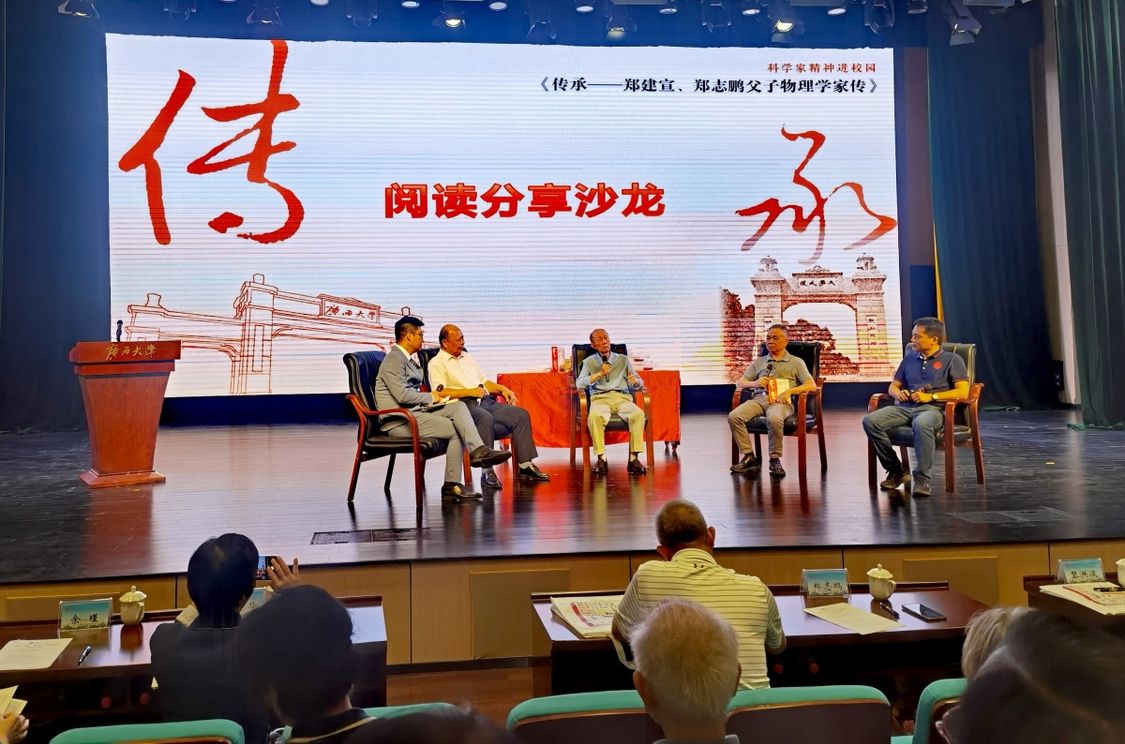 新書閱讀分享沙龍環(huán)節(jié),鄭志鵬老校長,鄭建宣校長學(xué)生代表、廣西科學(xué)院原黨組書記兼院長、廣西大學(xué)原副校長鐘夏平,鄭志鵬校長學(xué)生代表、廣西大學(xué)物理科學(xué)與工程技術(shù)學(xué)院副院長劉宏邦,《傳承》作者代表、香港文匯報廣西聯(lián)絡(luò)處原主任、大公報廣西辦事處原主任羅保華,上臺做交流分享。他們圍繞書籍分享了各自的觀點,讓大家更加深入地了解了鄭建宣、鄭志鵬父子的科學(xué)人生和科學(xué)家精神。