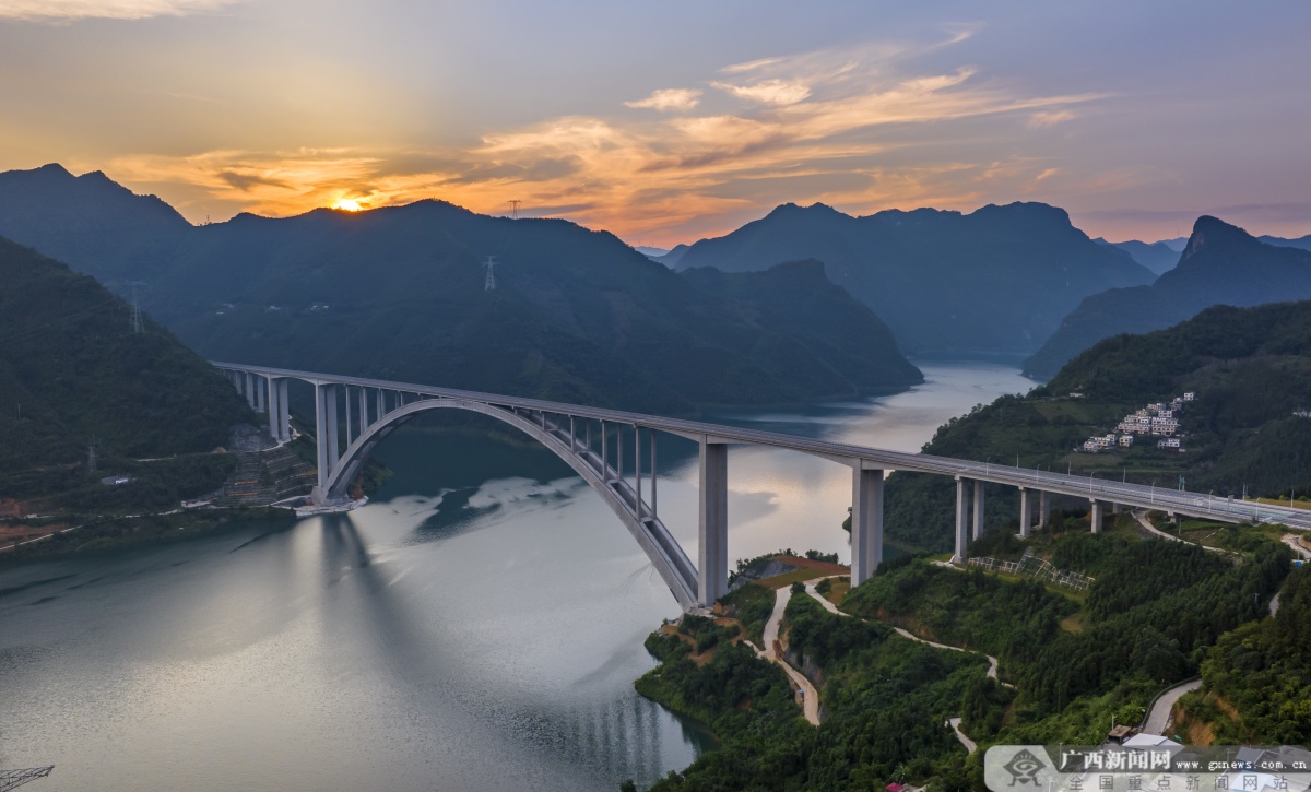天峨龍灘特大橋橫跨河池市天峨縣龍灘水庫,主橋為跨徑600米的上承式勁性骨架混凝土拱橋,是目前世界最大跨度勁性骨架混凝土拱橋,引領世界拱橋正式邁入600米級時代,實現世界拱橋發展史上里程碑式的跨越。
