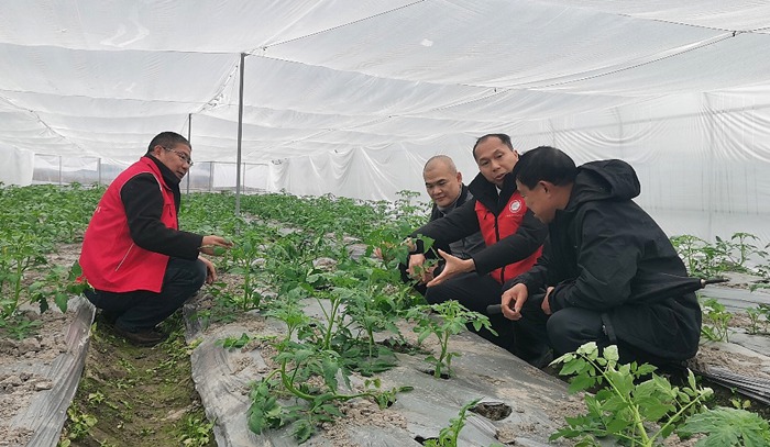唐小付(右二)在基地指導番茄防寒生產。梁華勝攝