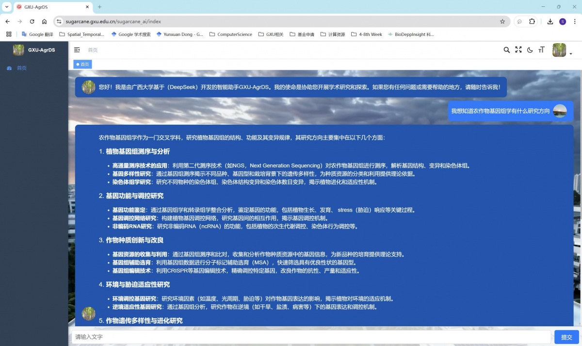 在試用期內,校內外用戶可通過域名https://sugarcane.gxu.edu.cn/sugarcane_ai/注冊登錄后體驗網頁版AgrDS_V0的聊天功能,或通過https://sugarcane.gxu.edu.cn/sugarcane_ai_backup/體驗匿名版聊天功能。