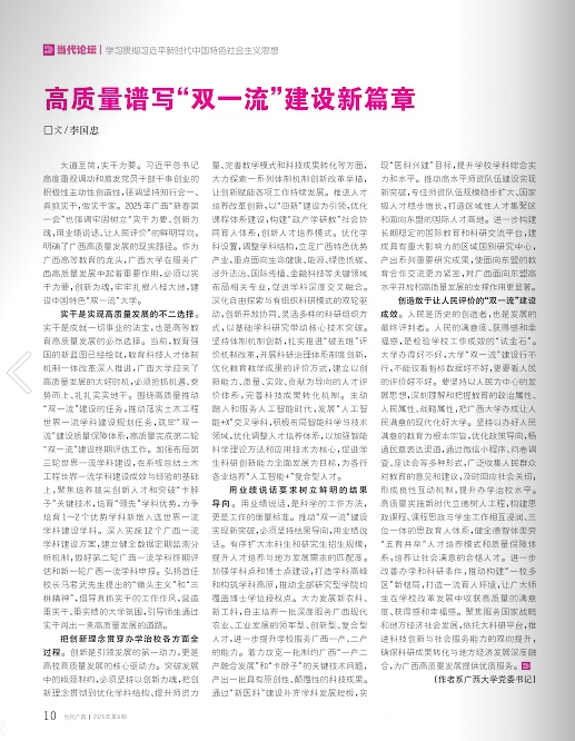 大道至簡,實干為要。習近平總書記高度重視調動和激發黨員干部干事創業的積極性主動性創造性,強調堅持知行合一、真抓實干,做實干家。2025年廣西“新春第一會”也強調牢固樹立“實干為要、創新為魂,用業績說話、讓人民評價”的鮮明導向,明確了廣西高質量發展的現實路徑。作為廣西高等教育的龍頭,廣西大學在服務廣西高質量發展中起著重要作用,必須以實干為要,創新為魂,牢牢扎根八桂大地,建設中國特色“雙一流”大學。