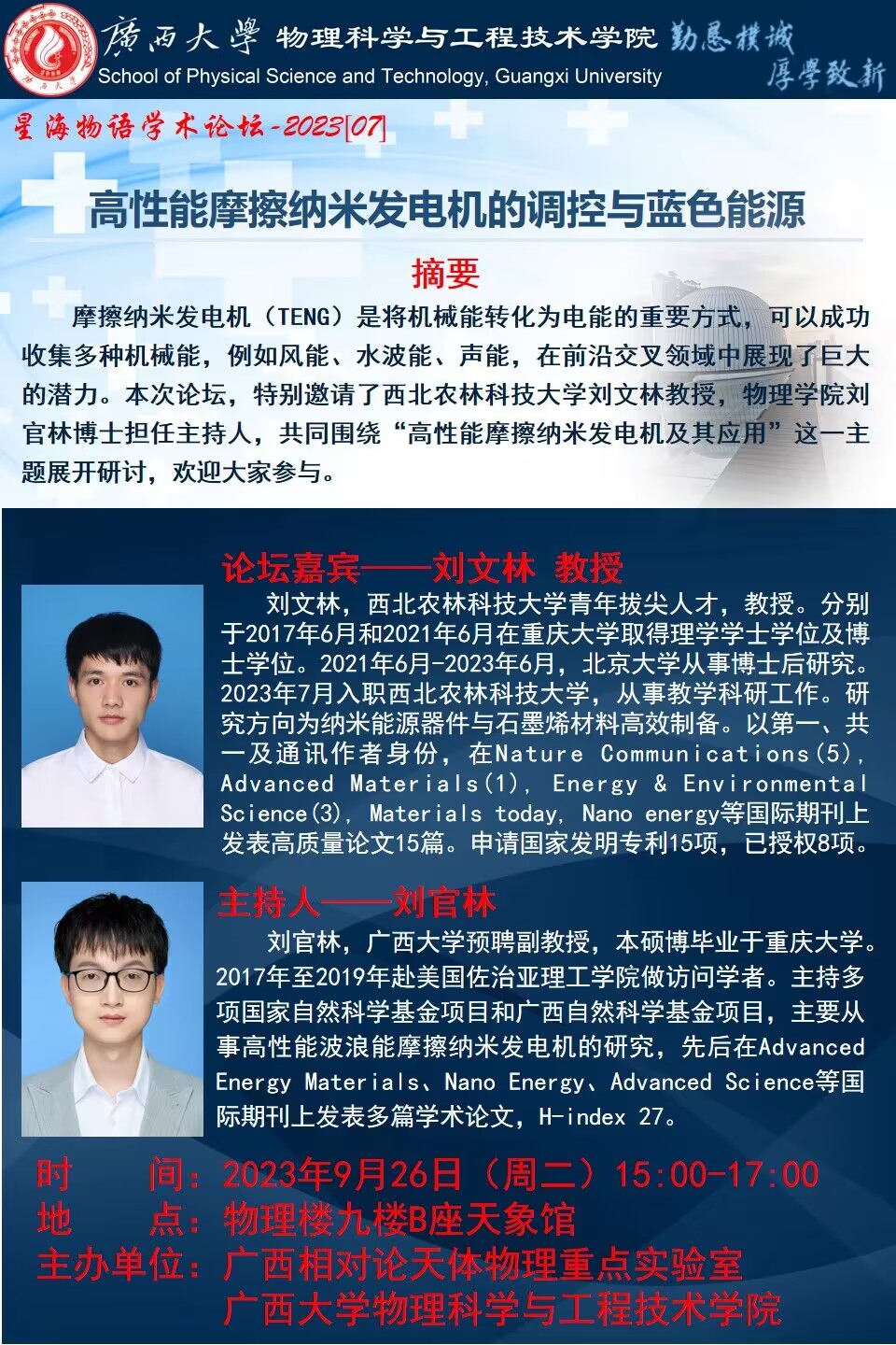 物理學院2023年星海物語學術論壇(第七期):高性能摩擦納米發電機的調控與藍色能源
