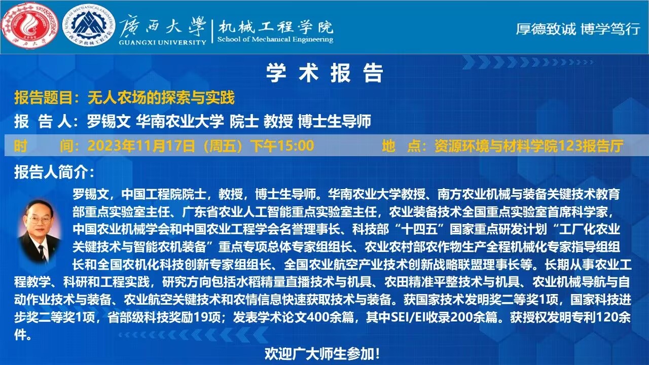 主講人 羅錫文 華南農業大學 院士 地址 資源環境與材料學院123報告廳
