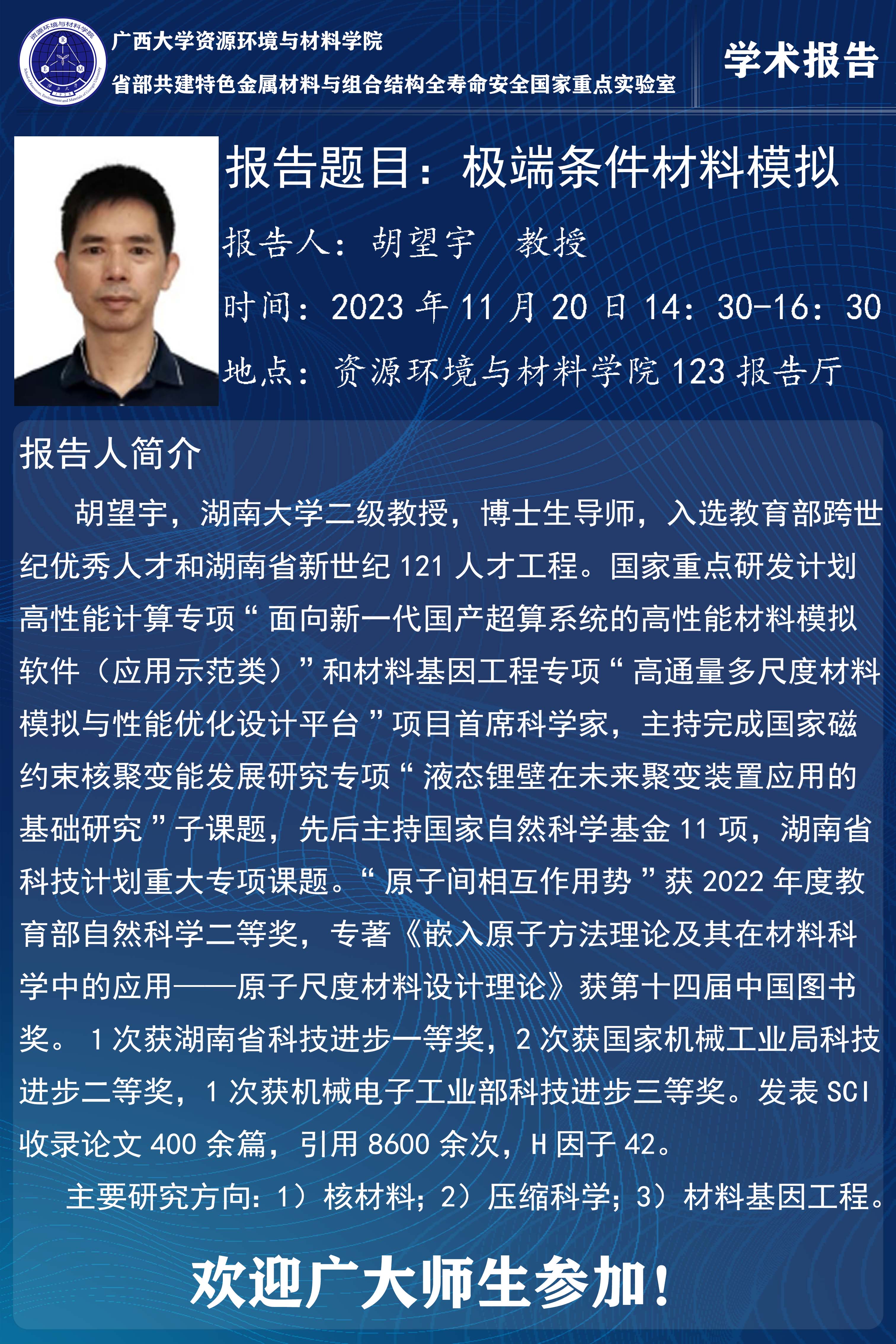 主講人 胡望宇 教授 地址 資源環境與材料學院123報告廳