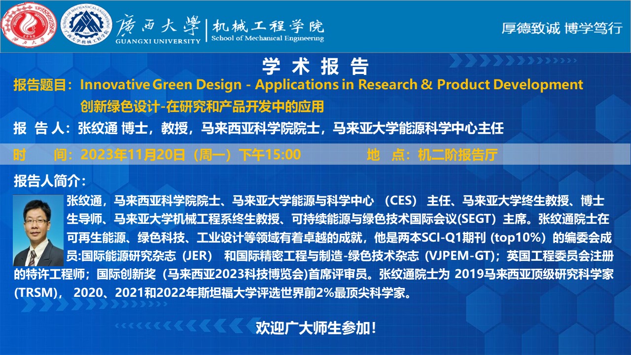 機械工程學院學術報告:Innovative Green Design - Applications in Research & Product Development 創新綠色設計-在研究和產品開發中的應用