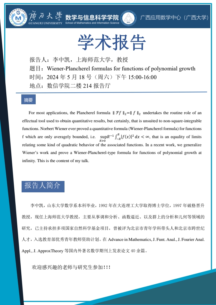 主講人 李中凱 上海師范大學教授 地址 數信學院二樓214報告廳