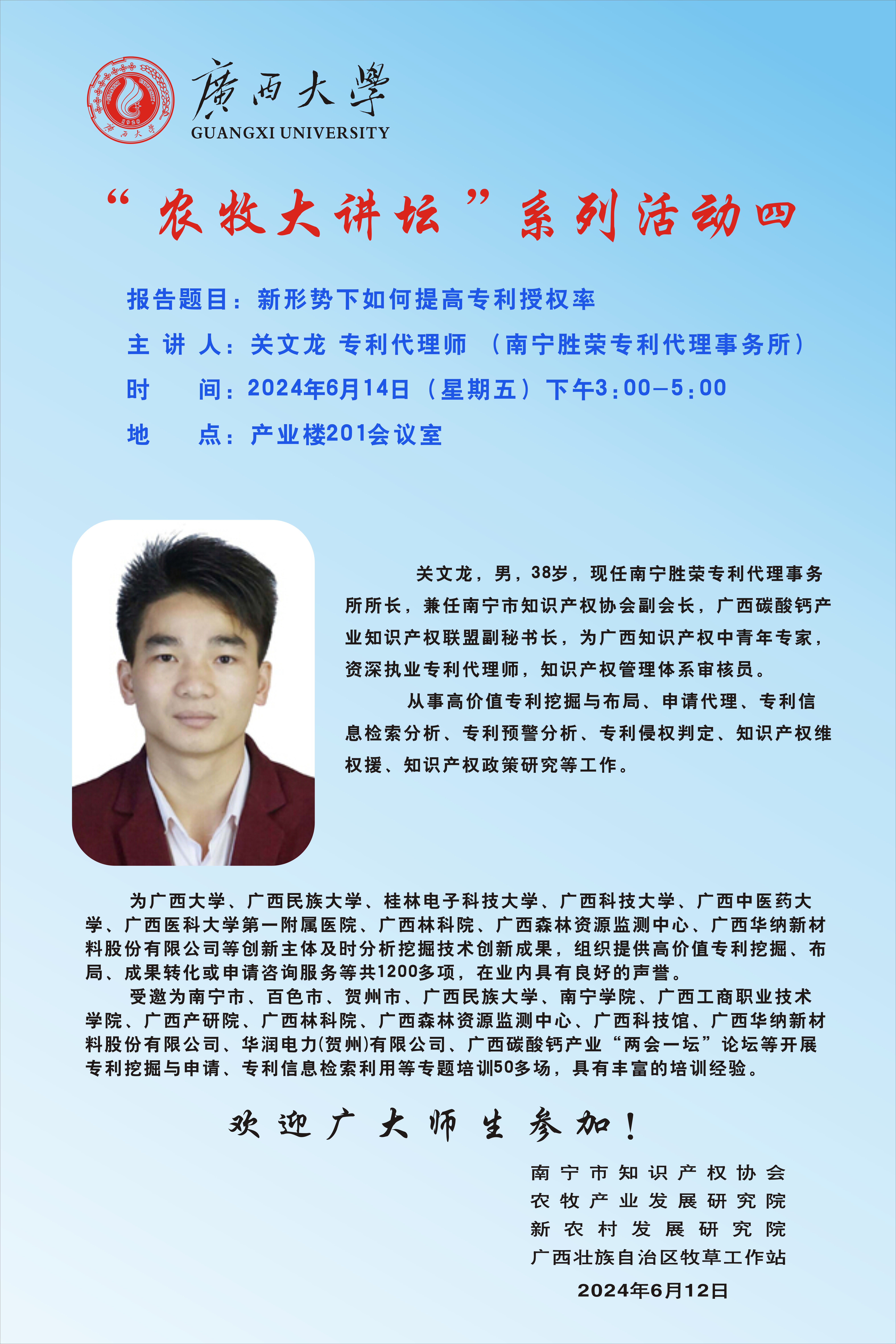 主講人 關文龍 專利代理師 地址 產業樓201會議室