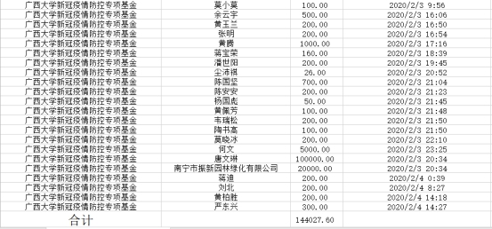 自廣西大學校友總會與教育發(fā)展基金會發(fā)布捐贈公告以來,截至2020年2月3日晚上7點整,基金會共接受捐贈31筆,具體明細如下: